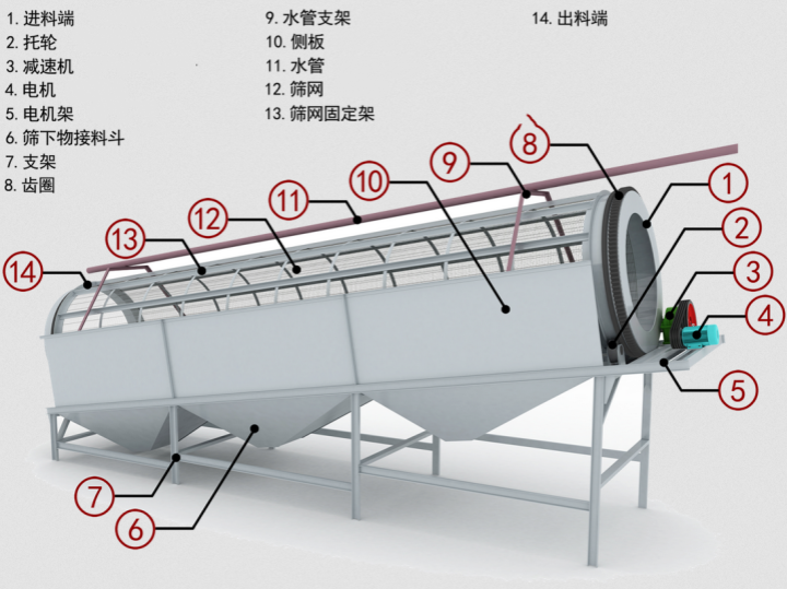 石英砂滚筒筛主要由电机、减速机、滚筒装置、机架、密封盖、进出料口等部分组成。滚筒装置是核心部件,各部件协同工作保证整台机器的正常运行。