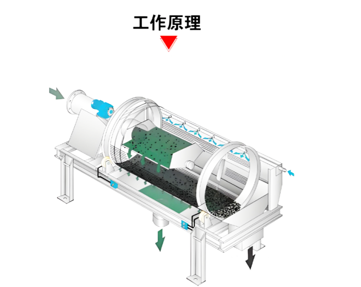 由电机带动滚筒缓慢旋转,石英砂从进料口进入滚筒后,在滚筒转动和内置导料板的作用下不断翻滚、抛撒。小于筛孔尺寸的砂粒透过筛网落入下方出料口,较大颗粒或杂质则沿滚筒末端排出,实现石英砂的粒径分级与除杂。